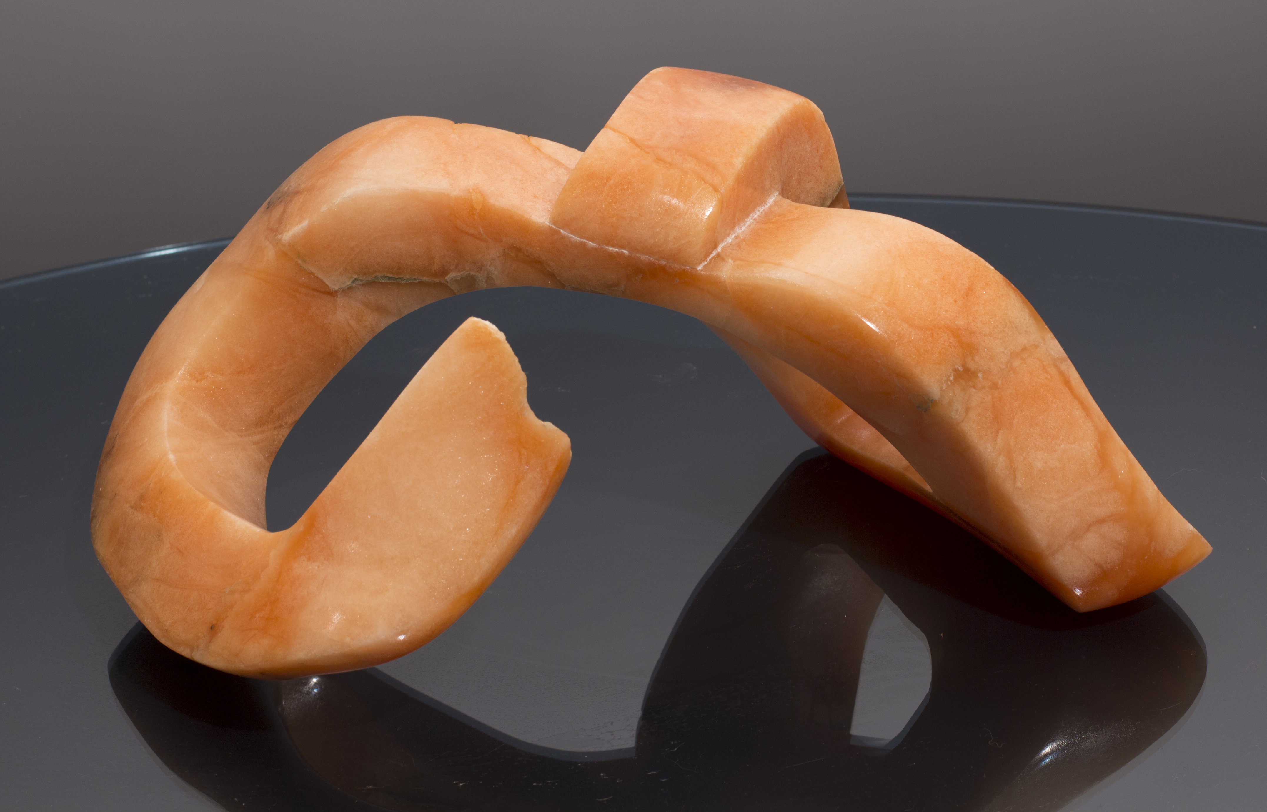 Infinite Endings is an orange alabaster sculpture shaped into a broken infinity symbol.