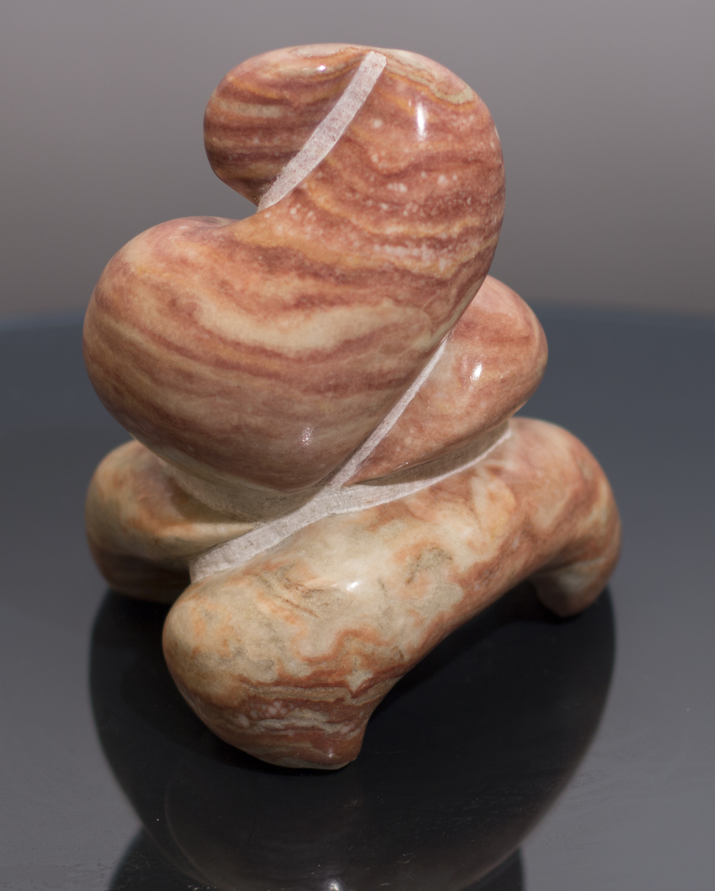 Infinite Beginnings is red raspberry alabaster formed into an abstracted infinity symbol. One of the pieces is broken in two. Is it coming together or pulling apart?