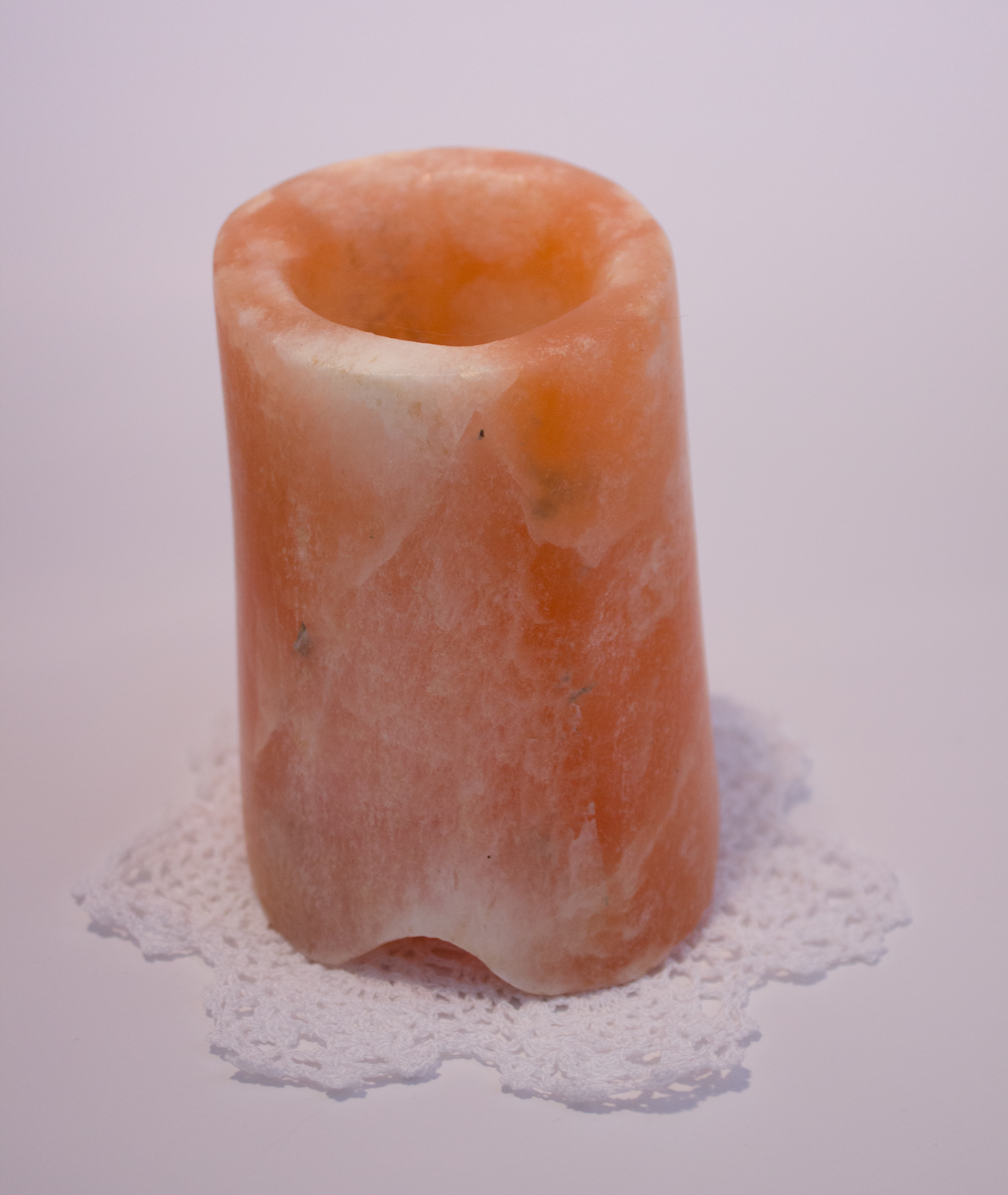 Translucent orange alabaster stone sculpture hand carved into a candle holder. It was chiseled, rasped, drilled, scraped, filed, sanded, and waxed. This one is not for sale, but I will be making more to sell soon.
